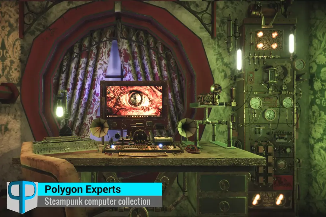 Steampunk computer collectionis a collection of high detail lowpoly models for the era of steampunk . Most of the models focus on computer parts and that’s why this name is chosen for this collection but despite of computer parts you can find “ Steampunk Camera “ , “Steampunk Radio”, “Steampunk fireplace “ and a steampunk interior as the demo scene .